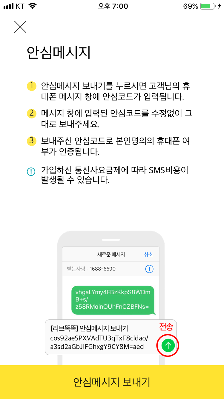 안심 메시지를 보내면 자동으로 안심 코드가 입력되어 전송만 누르면 된다.