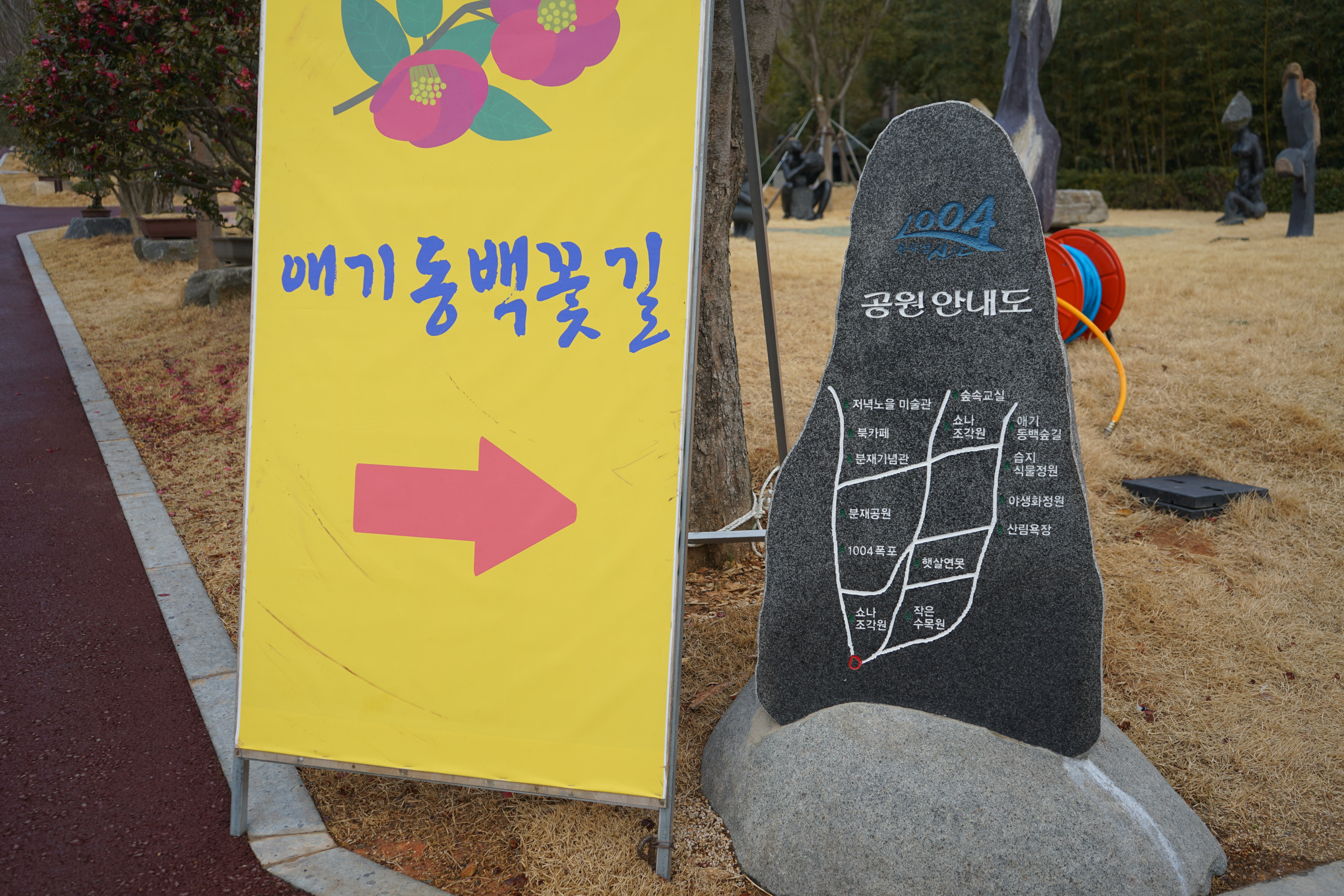가장 유명한 애기동백 꽃길은 큰 이정표 입간판이 있어 찾기 어렵지 않다.