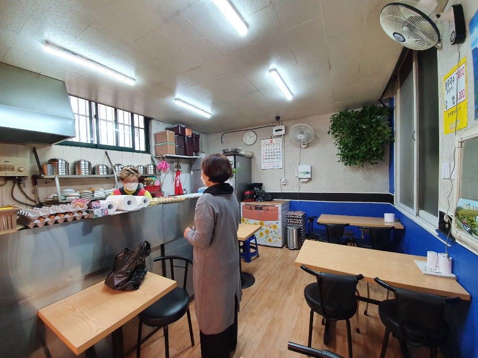 간판도 없이 노란 창문에 붙어 있는 김밥, 국수 스티커로 음식점이라는 것만 파악 가능했다.