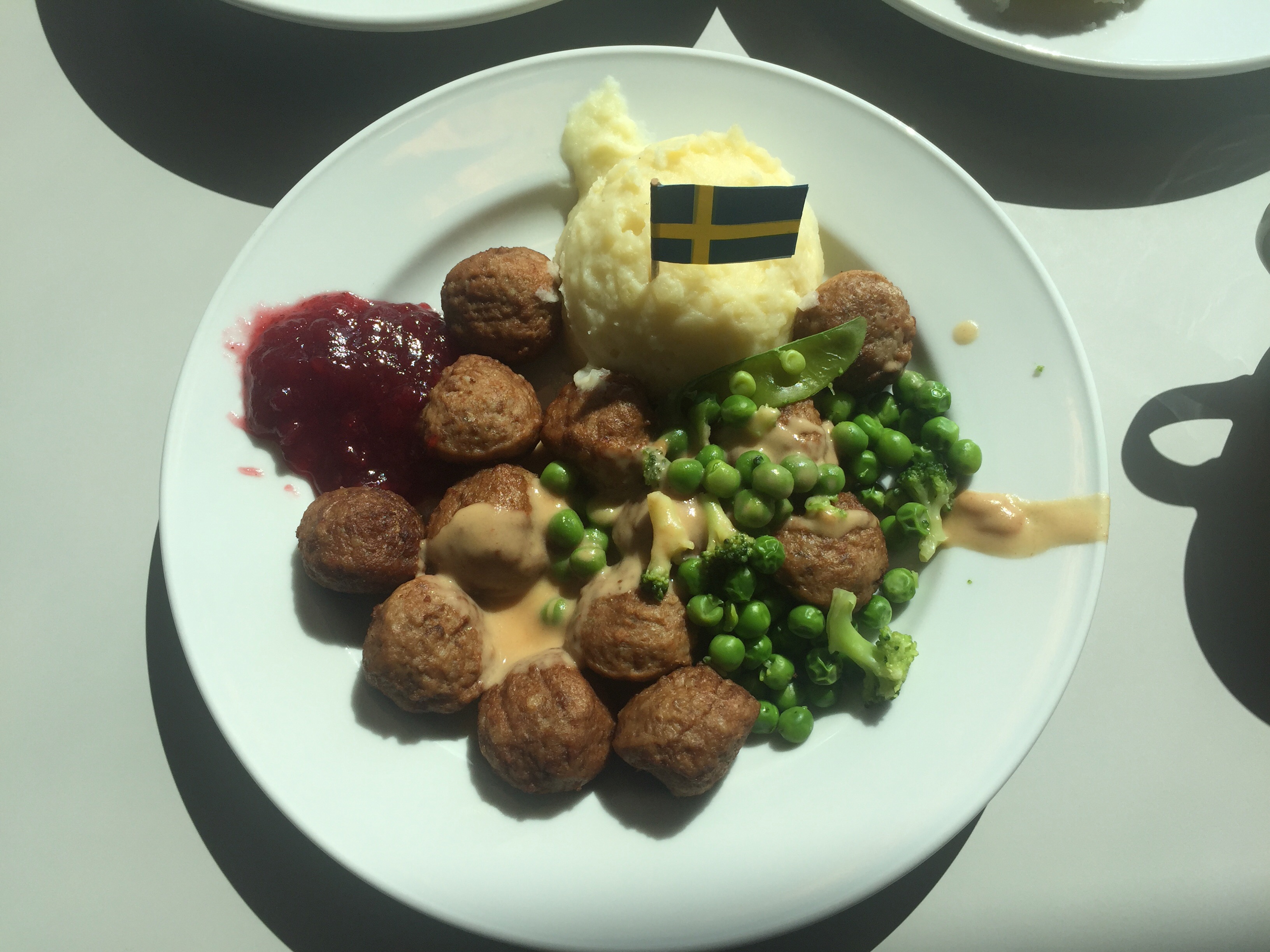 으깬 감자와 크림소스, 미트볼 완두콩과 링곤베리 잼이 나온다.